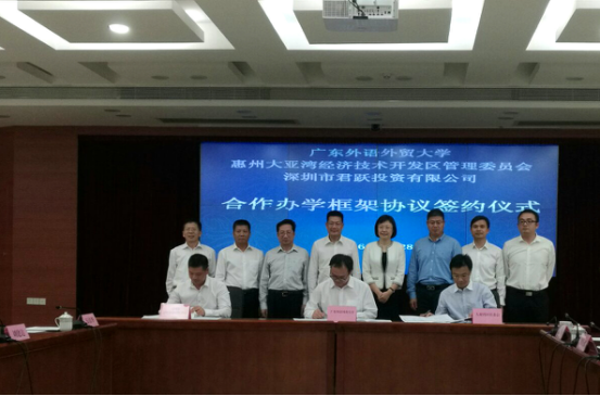 9月28日下午,我校与惠州大亚湾区管委会、深圳市君跃投资有限公司在大亚湾签署合作办学框架协议,约定三方共建广外附设大亚湾外国语学校。我校校长仲伟合、副校长刘建达、惠州市委常委、大亚湾区委书记张瑛、深圳市君跃投资有限公司董事长洪跃等出席签约活动。刘建达代表我校签约。