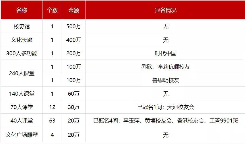 欢迎各位以个人、班级、年级的方式冠名认捐。目前冠名情况如下: