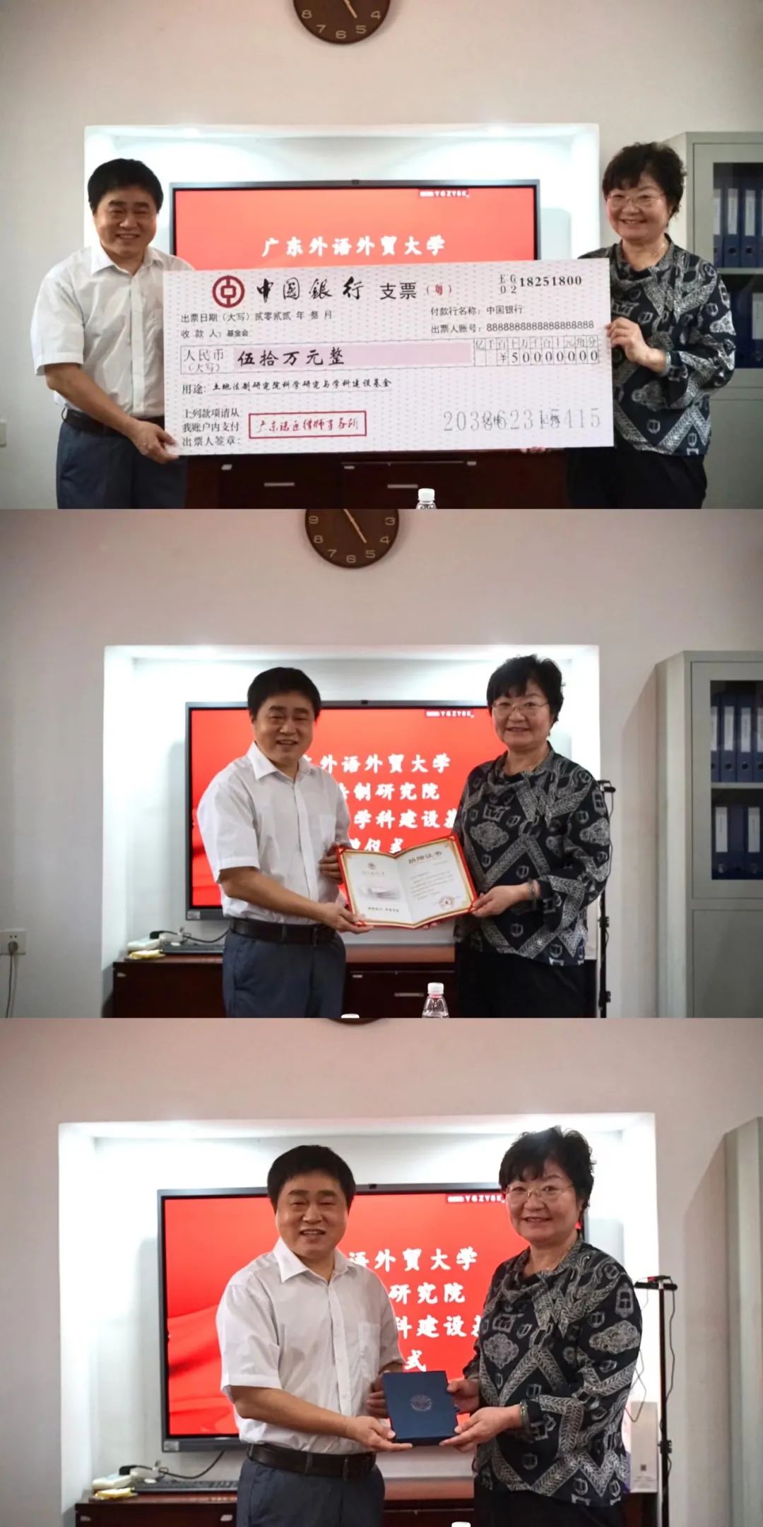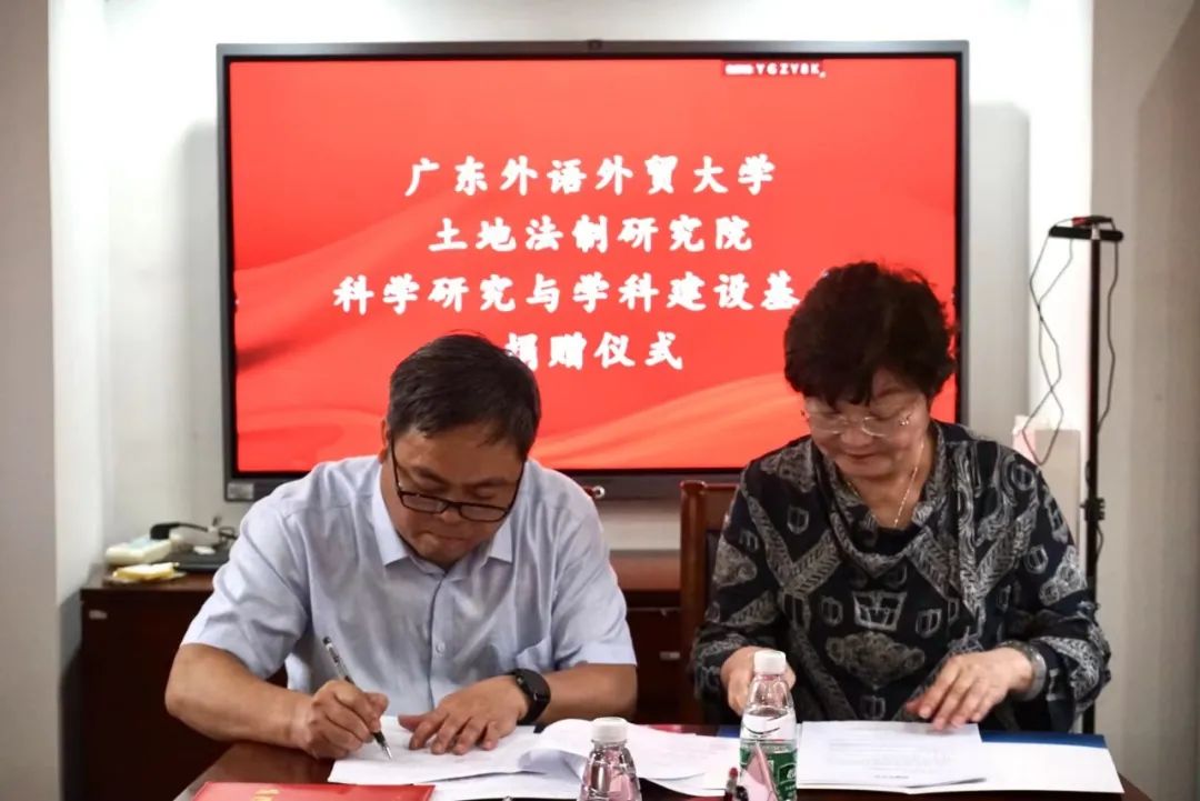 2022年3月15日下午,广东外语外贸大学“土地法制研究院科学研究与学科建设基金”捐赠仪式在北校区校友事务与合作发展处举行。广东诺臣律师事务所向广东外语外贸大学土地法制研究院捐赠50万元用于该院科学研究与学科建设工作。