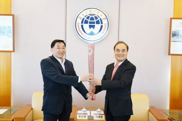 活动在轻松愉快的氛围中进行,李云明与刘展图校友交流畅谈。李云明感谢刘展图校友一直以来对母校发展的关心支持,他向刘展图校友介绍了学校的发展情况,近年来学校凝聚各方力量,整合多方资源,强化办学特色,实现了人才培养新绩多,科研成果创新高的良好发展局面。谈到母校与校友的深厚情谊,他指出,校友是学校宝贵的财富,是助力学校发展的重要力量,刘展图校友捐赠奥运火炬,寓意着广外精神与广外情怀的薪火相传,对于广大的学子是一种榜样的引领,“更高、更快、更强、更团结”的奥运精神也必将同样激励着在校学子积极进取、勇攀高峰。