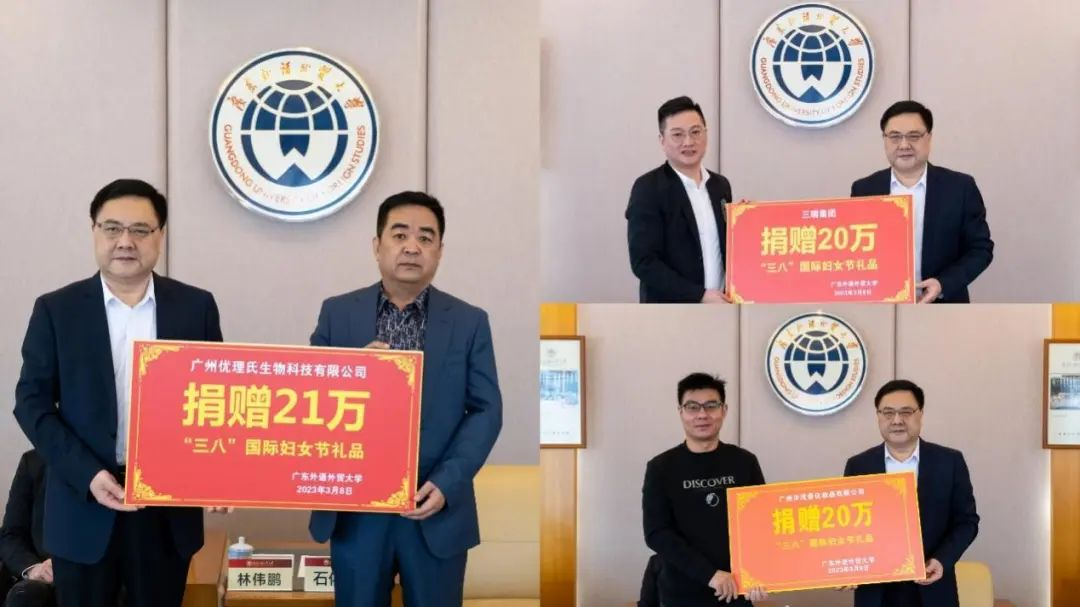 3月8日上午,“三八”国际妇女节礼品捐赠仪式在白云山校区行政楼迎宾厅举行。校党委书记石佑启教授出席仪式并致辞,捐赠企业代表广州市三瑞集团董事长林伟鹏、优理氏生物科技有限公司董事长李占鸿、浅香化妆品有限公司法务经理范林志,人力资源部部长、教师工作部部长、教师发展中心主任谢文新,校友事务与合作发展处副处长刘庆丹等相关人员参加仪式。