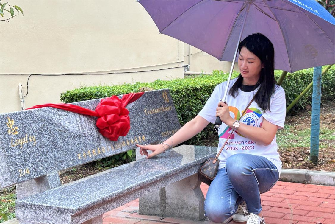 当天,时值公开学院英语三系2003级校友入学20周年值年校友聚会。在樱花树旁,校友们还向学校捐赠了四张景观石凳,分别用中英文镌刻“孝、悌、忠、信、礼、义、廉、耻”等中国传统文化八德。
