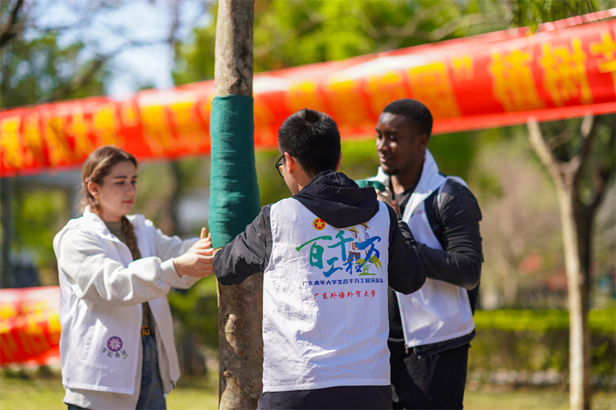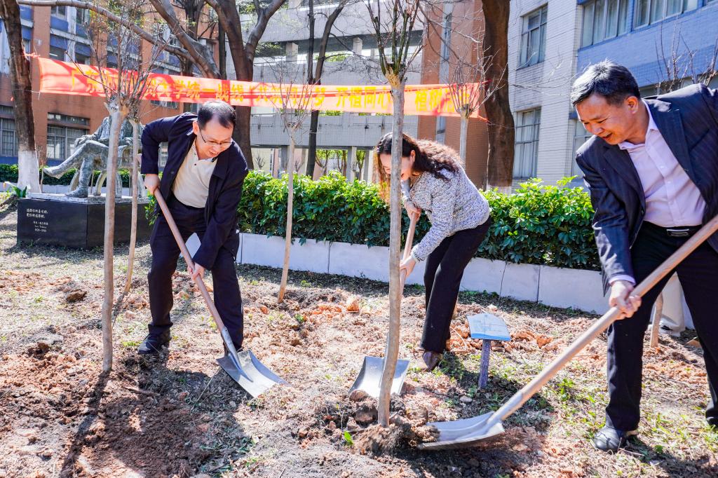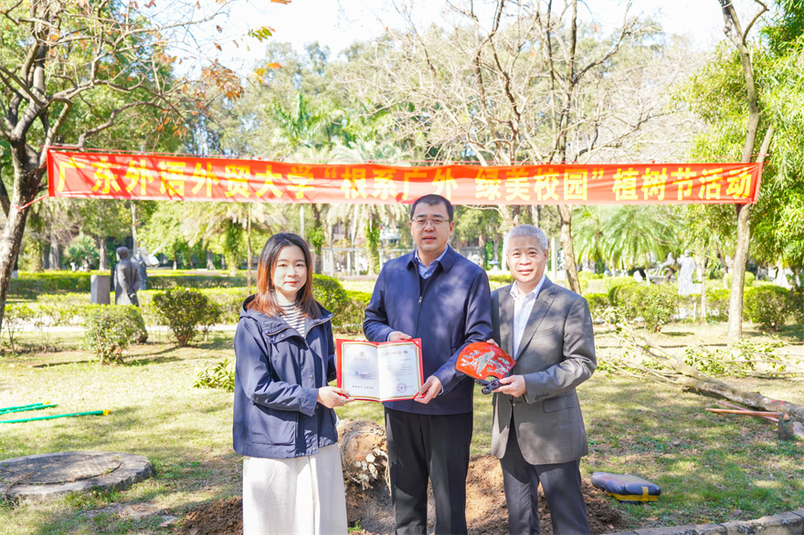盎然春光三月好,植绿护绿正当时。在第46个植树节来临之际,为深入贯彻习近平生态文明思想,牢固树立和践行“绿水青山就是金山银山”的理念,我校在白云山校区、大学城校区分别举行“根系广外,绿美校园”和“同心林”植树节活动。校长闫相斌,副校长申明浩,与师生代表、学生志愿者们一同参与植树活动。化州市绿色生命有限公司董事长李向明、我校校友李雅清向我校捐赠80株沉香佳木,云山金谷孵化器有限公司董事长曾卫和向我校捐赠16株罗汉松。