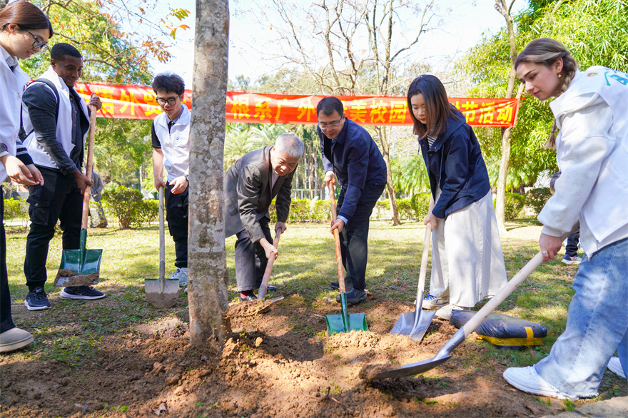 党委办公室、校长办公室、统战部、宣传部、校团委、学生工作部、总务后勤部负责、校友发展处同志、留学生代表、学生代表及物业公司代表参与植树活动。据悉,本次植树节活动共有256株树苗被种下,品种包括沉香树、罗汉松、樱花树、紫薇树等。它们根植广外,成为校园里一道鲜亮的绿色风景线,与广外师生共同成长,迎接美好未来。