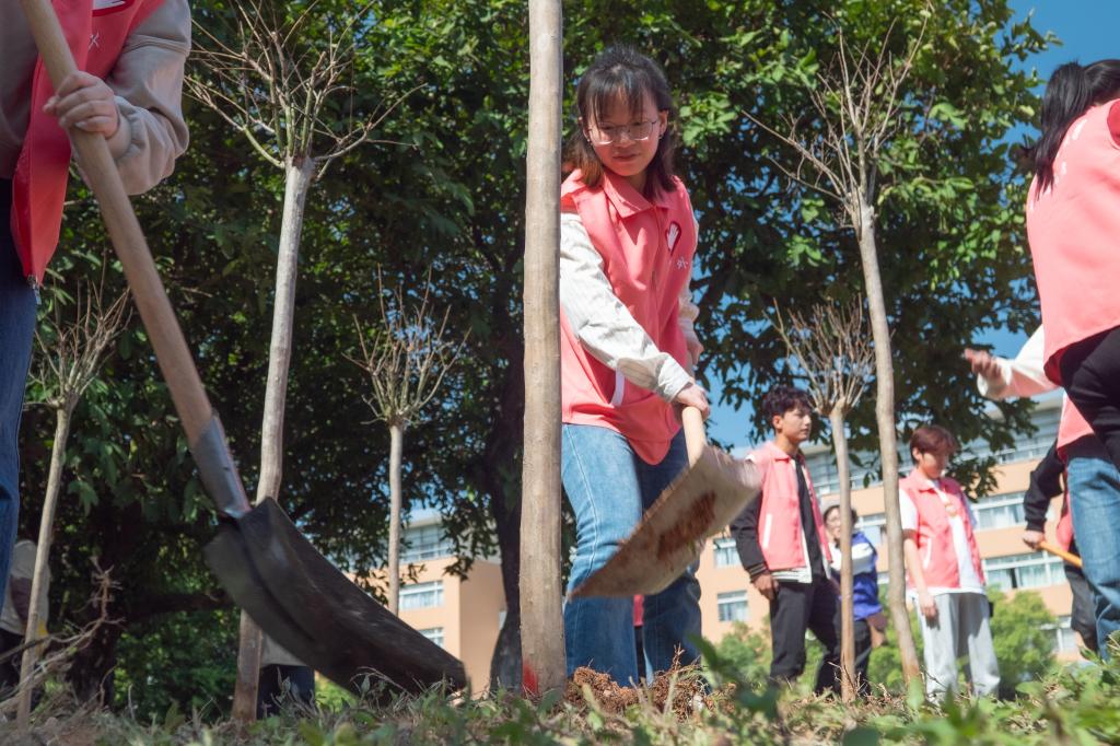 来自中文学院的学生志愿者梁嘉茹同学表示,这是她第一次真正参与植树活动,当亲手栽种的树苗可以被更多人看到,为校园增添一点绿意时,她的内心充满自豪。来自经贸学院的刘耀庭同学在活动中体验到和老师、同学一同植树的乐趣,他呼吁大家共同行动起来,保护好身边的绿植,共创良好的生态环境。
