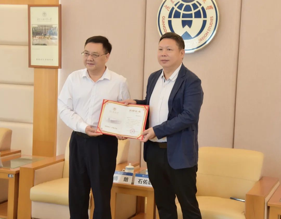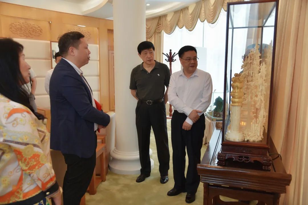 石佑启首先对来宾的到访致以热烈欢迎,并介绍了广外近年来丰硕的建设成果。石佑启表示,要坚定文化自信,建设文化强国,向世界传播中华优秀传统文化,讲好中国故事,广外要强化履职尽责,践行使命担当。广外是育人的沃土,文化润校、文化强校在有序推进。本次受赠的骨雕充分展现中华优秀传统文化,将岭南文化之精髓与大展鸿图之祝愿寓于其中,工艺精湛,格调高雅,丰富了广外的宣传展示窗口,为明年的六十周年校庆加深了文化艺术支持。